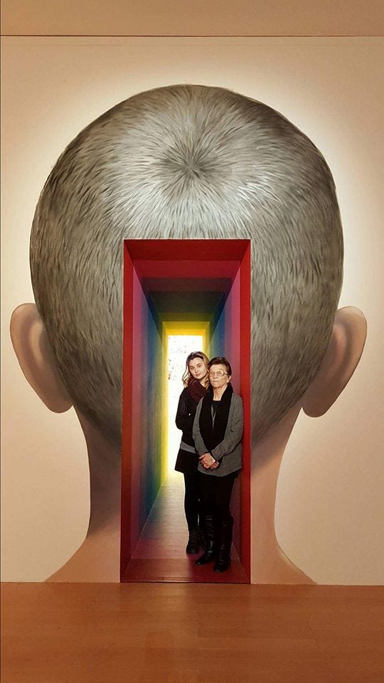 I woke today thinking of this picture of us in the Musee d’Art Contemporain de Lyon—in the hometown of my husband. One of the rewards of life is seeing what you couldn’t in the past, meaning given and enhanced. It was December 2016. We stood and because the moment was captured, we stand in the head of a boy, probably, maybe. I stand behind her in a rainbow doorway. She looked more like the Granny of my childhood. Dark hair, glasses, wearing black and gray, solemn in photos. It is a surprise she agreed to a photo because she rarely did after she believed she’d lost her beauty. She allowed photos more often in these last trips.